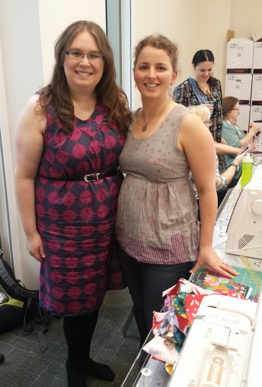 My fellow classmates were making some AMAZING flowers. I was so inspired by them and I can't wait to make more kinds (check out Ashley's post for some eye candy). I took a ton of pictures but I'm not sure which one's belong to which quilter (the whole workshop was a bit of a blur) so I won't post them here. But, here's Renee and I, smiling away when class was just beginning, and an AMH photobomb (someone on Instagram commented that if anyone is allowed to photobomb, it's AMH). :)