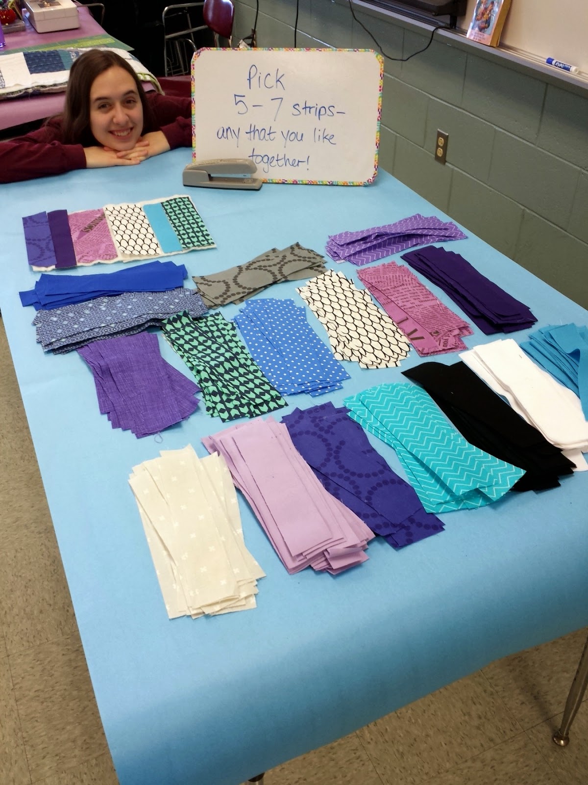 My sister Marisa helped me set up the room (just like last year!) :). I precut the fabric and batting; basically, students chose 5-7 strips, filled a rectangular piece of batting, brought it to me to sew up, and had the option of watching how I work the machine. I found out quickly that there are a lot of Pearl Bracelet fans! Both boys and girls expressed interest in learning how to sew. It was invigorating. :) I didn't get any pictures of when the kids came in because it was madness; I was sewing and talking up a storm. We made about 80 quilt blocks that day!