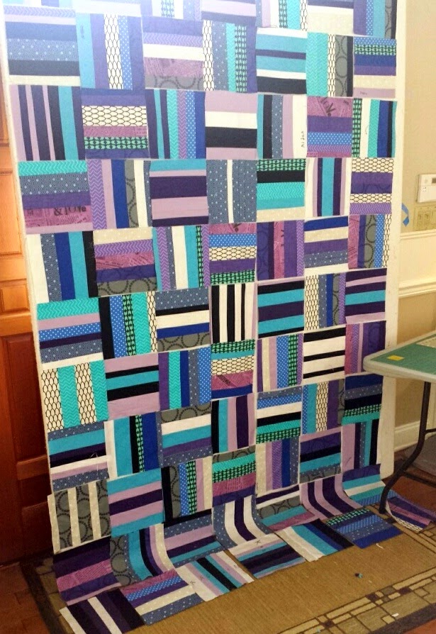 I laid out the top on Sunday, and finished piecing it together today! I let the squares (9 inches unfinished) fall relatively randomly (I tried to space out the all-solid blocks).