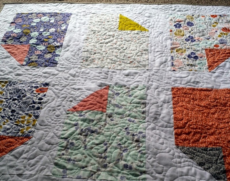 These colors would make a great baby quilt such as this one. The piecing took longer than the other quilt (lots of HSTs) but it was fun to see tulips popping up on my floor/design wall. I really took advantage of the white space on this one; I pebbled in the sashing to make it pop.