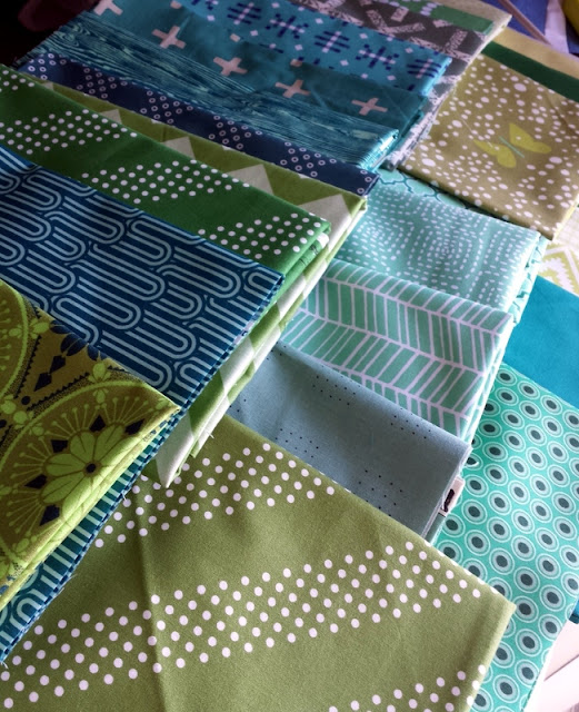 I chose mostly tone-on-tone fabrics in a variety of colors, plus some solids (and stayed away from most "flowery/girly" prints). I can't wait to start cutting! Thanks to the Intrepid Thread for their awesome selection of greens (all conveniently grouped together)!