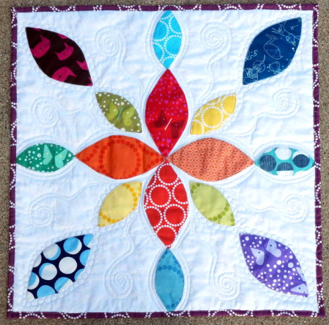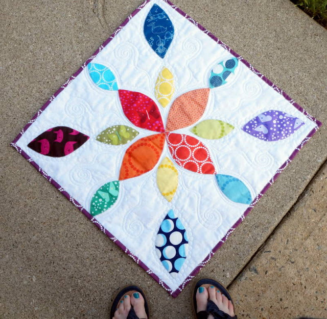 Bound and backed in more Pearl Bracelets (did you notice that the white background is Pearl Bracelets, too?), I think it's safe to say that this mini quilt has been completely conquered by the PBs.