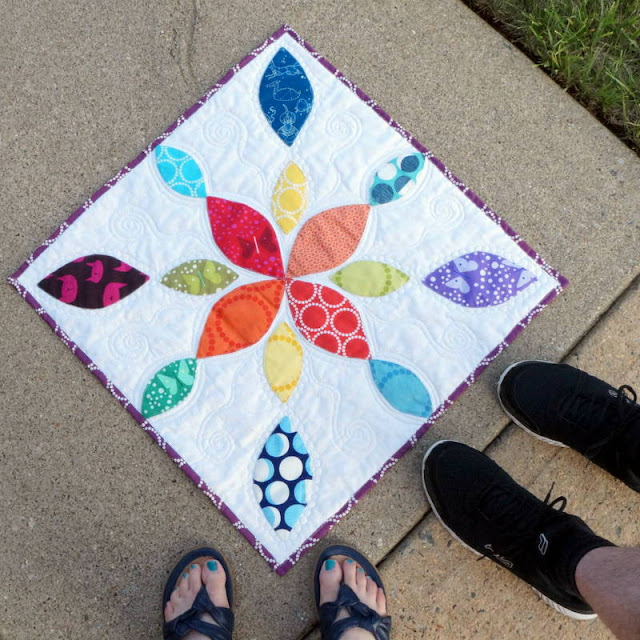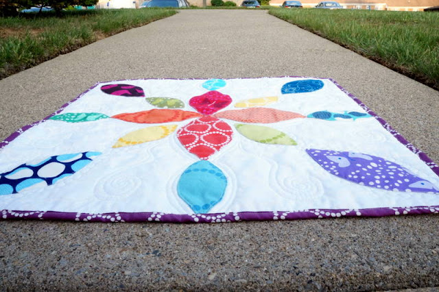 It took a lot of willpower *not* to quilt this one to death. For the sake of design, I wanted the quilting to really pop and allow the prints to dominate. I've been really into pebbling lately, and as I pondered that fact, a crazy (but awesome) idea jumped into my head: outline the petals with pebbles. I usually go with my crazy awesome ideas, and I'm almost always pleased. I quilted with my signature light gray Aurifil 2600 (Dove), which makes the quilting show a little bit more than a white thread would have.