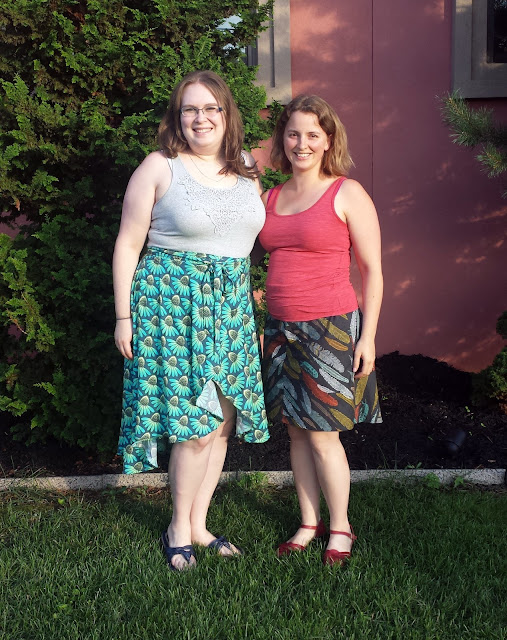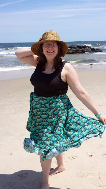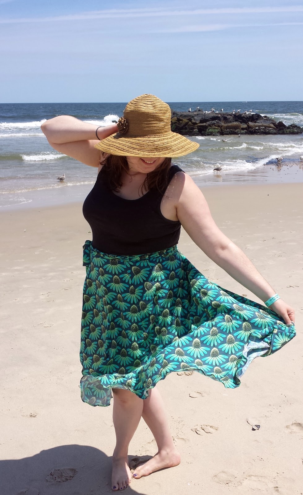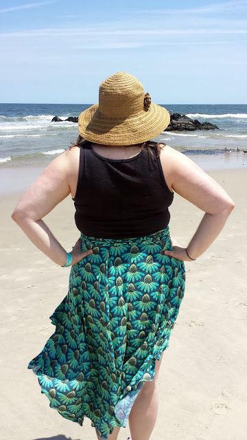I absolutely LOVE how it came out! The best part about it is being able to wear my favorite fabric (have I mentioned that I own the Echinacea prints in almost every color and substrate?). I am so happy with the scalloped look - an unplanned effect of the stretchy rayon - and how it fades from shorter in the front to longer in the back. It is THE perfect wrap skirt for the beach and for summer barbecues. Look at how it flutters in the wind!
