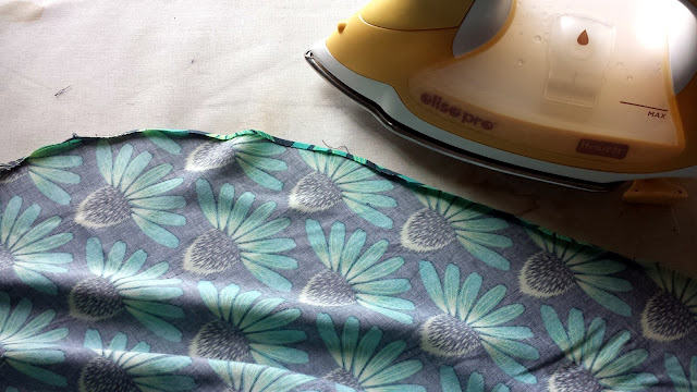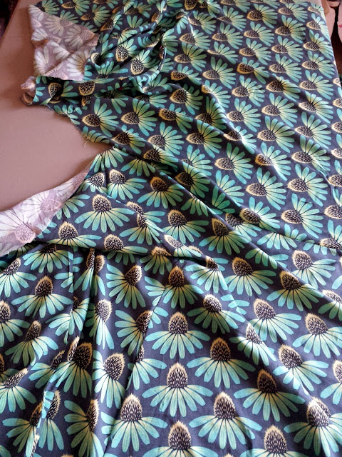I also had to work with the directionality of the Echinacea; they all needed to tilt about the same way. As a result of the size changes and directionality, I had to cut the pieces of the skirt separately and sew them together (this was completely different from the pattern). My advice to beginning garment sewists who want to adjust to their body type - make sure you buy plenty of extra fabric if you are enlarging the pattern or if it's directional!