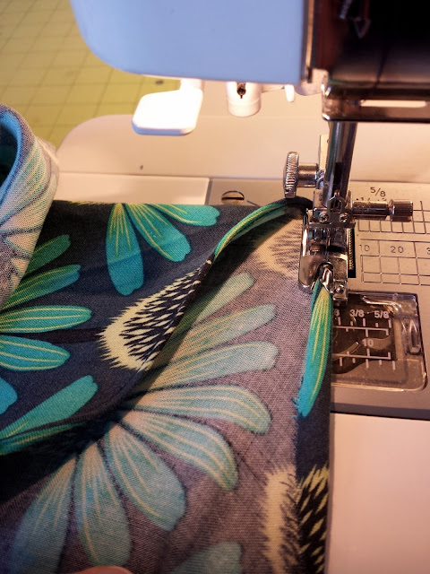 A rolled hem foot takes the fabric as you sew and rolls it over a second time to create a finished hem. I found it easiest to press my fabric an 1/8th of an inch all the way round first. Once you get into a groove of using the foot, it's like magic.