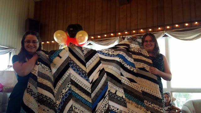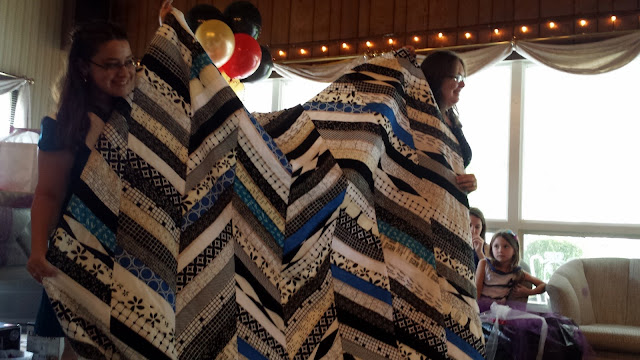 One of Brian's relatives also gifted the couple a lap quilt; it was started by his grandmother who has since passed away, and it was then finished for the couple. It looked hand pieced and it was just lovely. The sentiment of quilt giving was everywhere! I don't think I'll ever go to another shower without gifting a quilt (as long as I can manage it :) ).