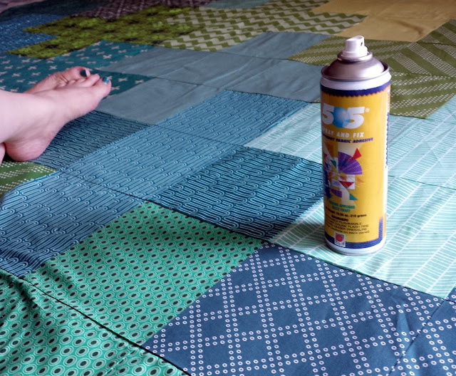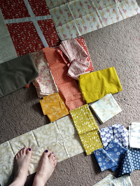 There's a lot going on in the Quilty Habit studio these next couple of weeks. I'm making a wonky cross quilt with a bunch of different fabrics from Cloud 9 Fabrics; I'm hoping to teach a class in the fall/winter. It's basic slice and insert piecing with my favorite "planned" improvisation. This project is pure fun and I get excited just thinking about it. That's why I snapped this picture of it all on my floor/design wall. :D Sooo pretty - apparently I've been loving cascading colors lately. Plus I have purple toes. That's a win in my book.