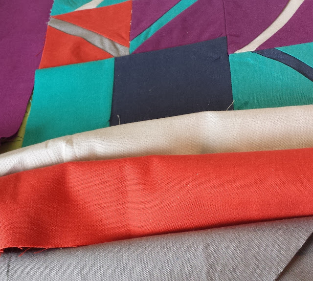 This doesn't look like much yet (because it's a sneak peek), but I was auditioning fabrics to finish my Cloud 9 Cirrus Solids Mini Quilt Challenge quilt for the August CJMQG meeting. It's improvisational cathedral windows, and I'd love to teach this technique, too. I totally made this up and it's been thrilling to experiment with.