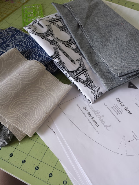 I couldn't help picking up some of this Rainwalk Canvas (the two fabrics on the left - also by Anna). The curvy motif was perfect for me. Not pictured: blue orange peels in the lining. ;) I can't stop - I won't apologize.