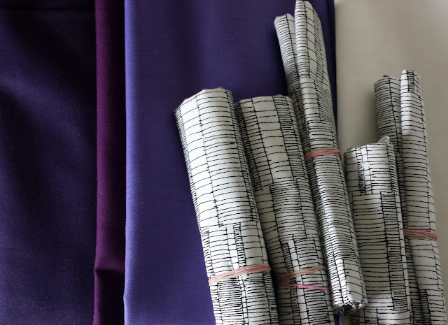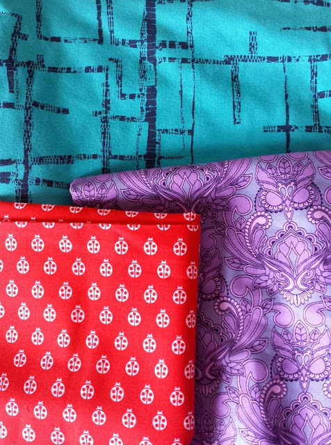 Right now I'm restricting myself only to those I'm always on the lookout for: helpful, modern red fabric (hard for me to find ones I like) and purples (because PURPLE, guys. PURPLE). I have never bought Tula Pink fabric (really! I'm not a huge fan of animals on fabric) but these ladybugs and owls more than fit my red and purple test (and I LOVE THEM). Also, that knit fabric (Maze Blues from Imprint by Katarina Roccella)? I don't know how it snuck into my bag, but I'm glad it did, because I could use a cute skirt (I have a weakness for buying garment fabric, too...).