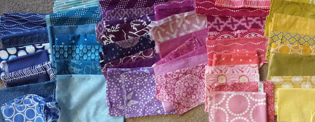 I also bought all the fat quarters PQW had of that beautiful Doe print (five, to be exact) because I need them for my rainbow selvage bookcase quilt. Then, since I'm taking the Meadow Quilt class with Lizzy House next weekend (!) I had to buy background fabrics and petal fabric (you'll have to tune in to my upcoming post about the workshop to see how I use them - again, PURPLE!). Below is my color palette for the rest of the quilt (all from the stash, thank you very much!). I told you I like helpful fabrics. :) P.S. If you're anywhere near Central New Jersey you should sign up for our workshop!