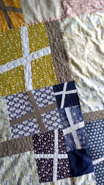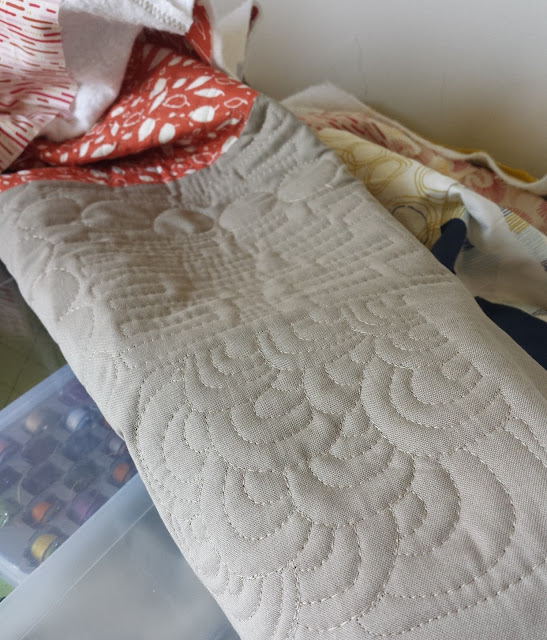 I have a healthy amount of sewing time this week, so up first is quilting my Cloud 9 Fabrics quilt (mostly featuring Rain Walk by Anna Graham). It's such an autumnal quilt and I'm really enjoying quilting the wonky crosses with 4 different motifs: swirls, rainbow-like baptist fans (one of my favorites ever), planks, and pebbles. My friend Neva gave me the idea at our recent sewing night. I'm using my trusty Aurifil #2326; this quilt called for a beige/tan color instead of my typical dove/light gray.