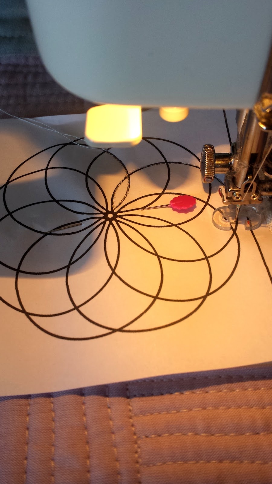 Then, I went to Google (oh, wise Google), typed in "mandala coloring books," and found Quality Kid's Crafts. I printed out the first PDF because it was exactly what I was looking for! I simply scaled the image down, pinned it to the quilt, and quilted right through the paper. In the past, I had done this for Shirley's Stars with great success in my book.