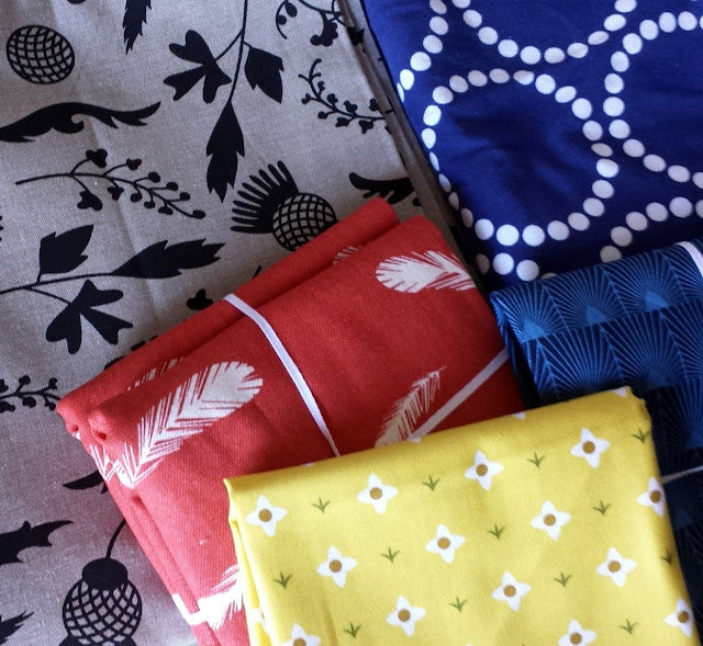 At my LQS Rock Paper Scissors, I picked up some lovely Botany Printed Chambray by Alison Glass (top left). I bought three yards because hey, I need a thistle dress in my life. This print is AMAZING - have you seen it in blue? Also, some of my friend are having an Outlander party soon, and if I can get my act together, I might be able to finish it for then. No idea what pattern I'll use yet, though.