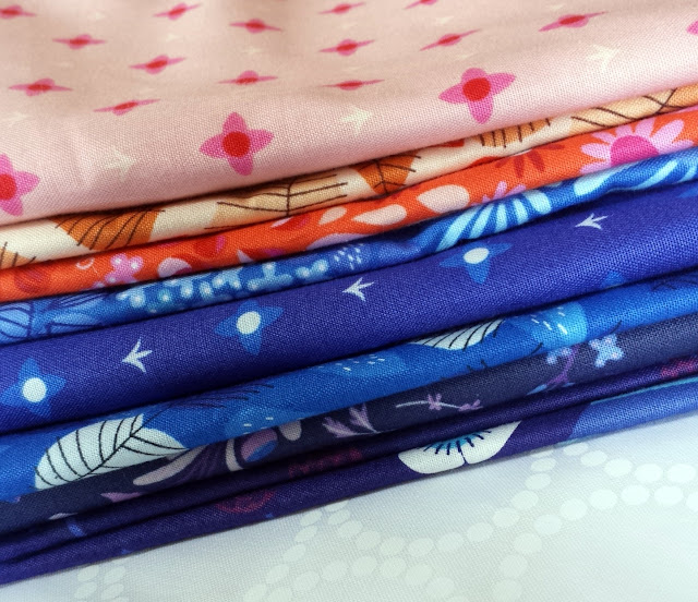 These half yards from The Lovely Hunt was a purely indulgent purchase from Hawthorne Threads. After seeing Lizzy House's new line at our CJMQG Meadow workshop a few weeks ago, I knew I had to buy those purples and blues. The orangey pinks are not really "me" but boy are they pretty. They are also lighter colors I happen to lack very clearly in my stash. I don't know what I'm making with these but I love looking at them! I might use the Meadow block prints (top and fifth from top) for binding, though.