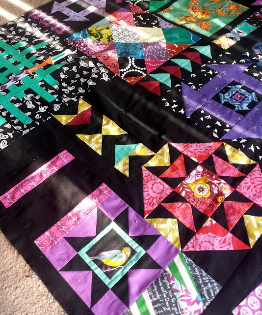 ReplyDeleteComing from a more traditional quilting background I would be inclined to ditch stitch the blocks (I know it is a real PITA but it really helps stabilise the different areas) and then have fun with different quilting designs in each area, there is a lot of nice negative space available.