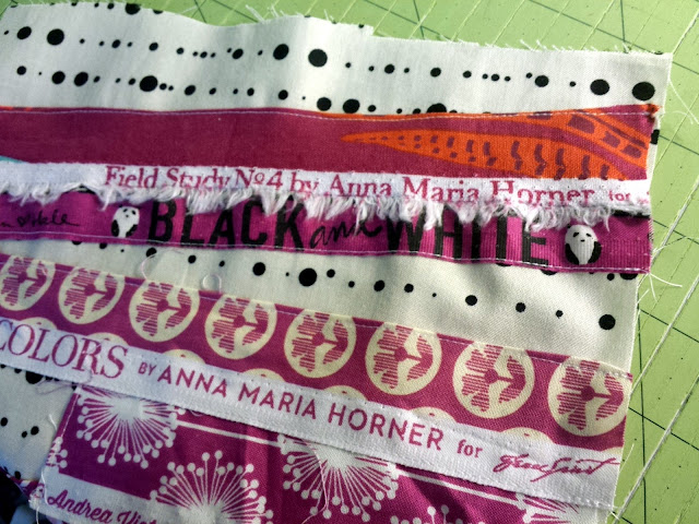 Another, easier way to sew selvages is to overlap them. The white part is a different kind of feel than the rest of your fabric, and can be appliqued or topstitched onto a background without fraying. Isn't that awesome? Plus, when you do this, you get to see the fluffy ends of the selvage! See above - in this picture, the top feather selvage was sewn directly on top of the "Black and White" selvage (the cutest selvage there ever was, am I right? Good job, Cotton and Steel). Here's another example: