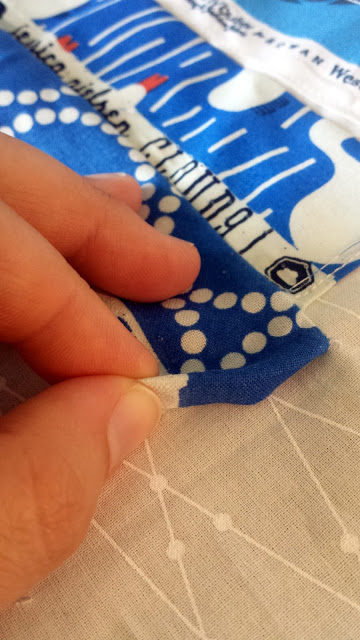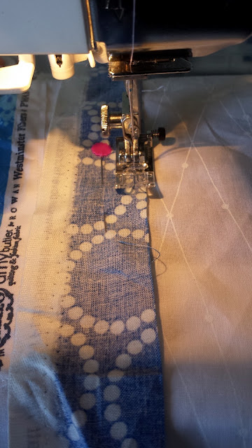 Here, I sewed the selvage on the right onto the feather selvage (about 1/8th of an inch away). I lifted up the fabric so you could see where I would be sewing. You can also see that the feather selvage was sewn on in the same manner.