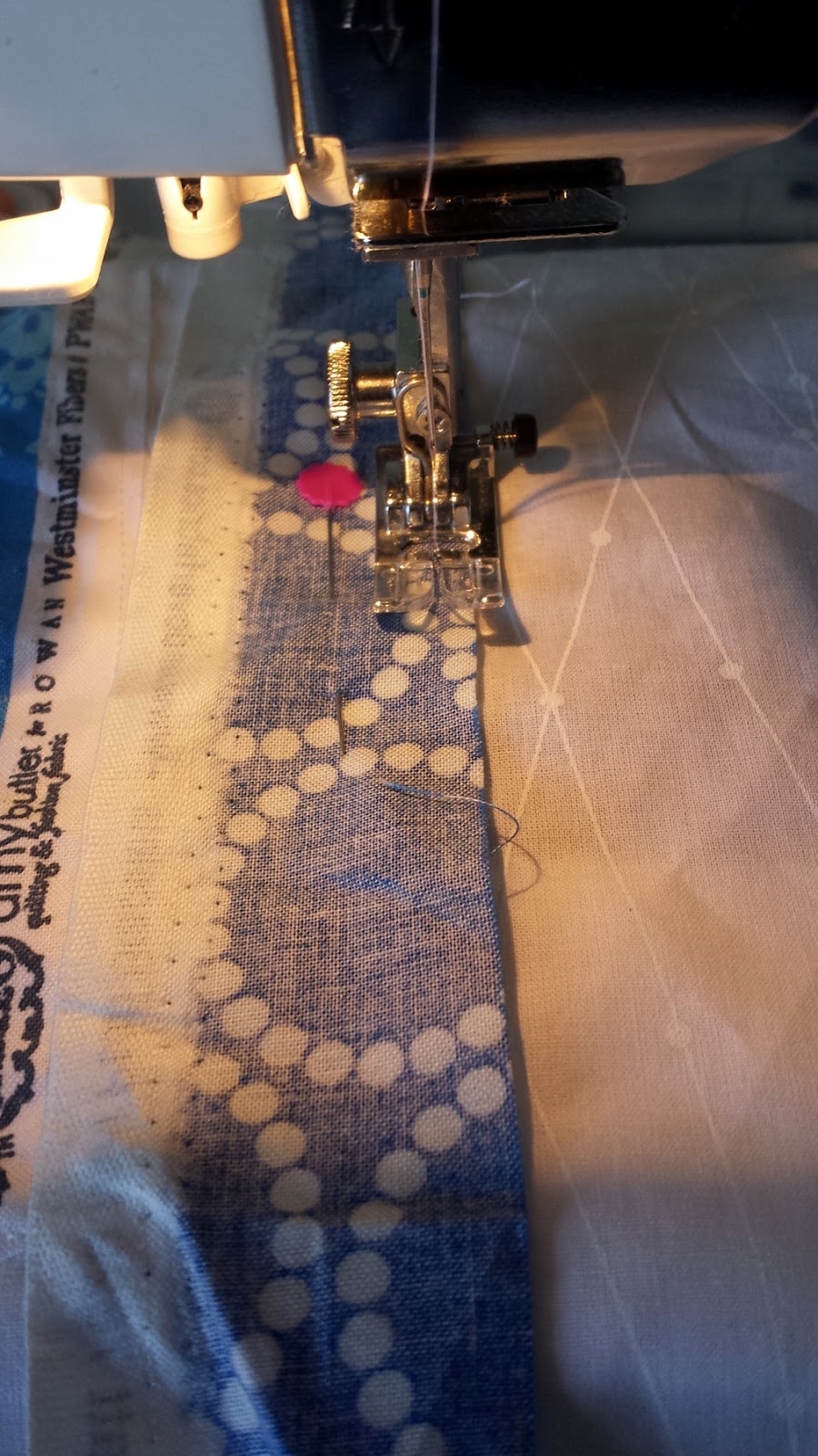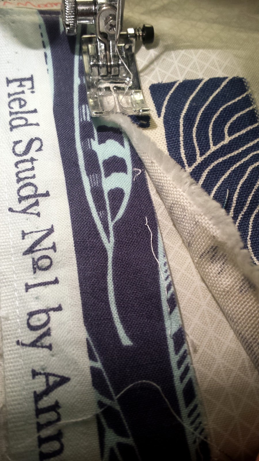 Here, I sewed the selvage on the right onto the feather selvage (about 1/8th of an inch away). I lifted up the fabric so you could see where I would be sewing. You can also see that the feather selvage was sewn on in the same manner.