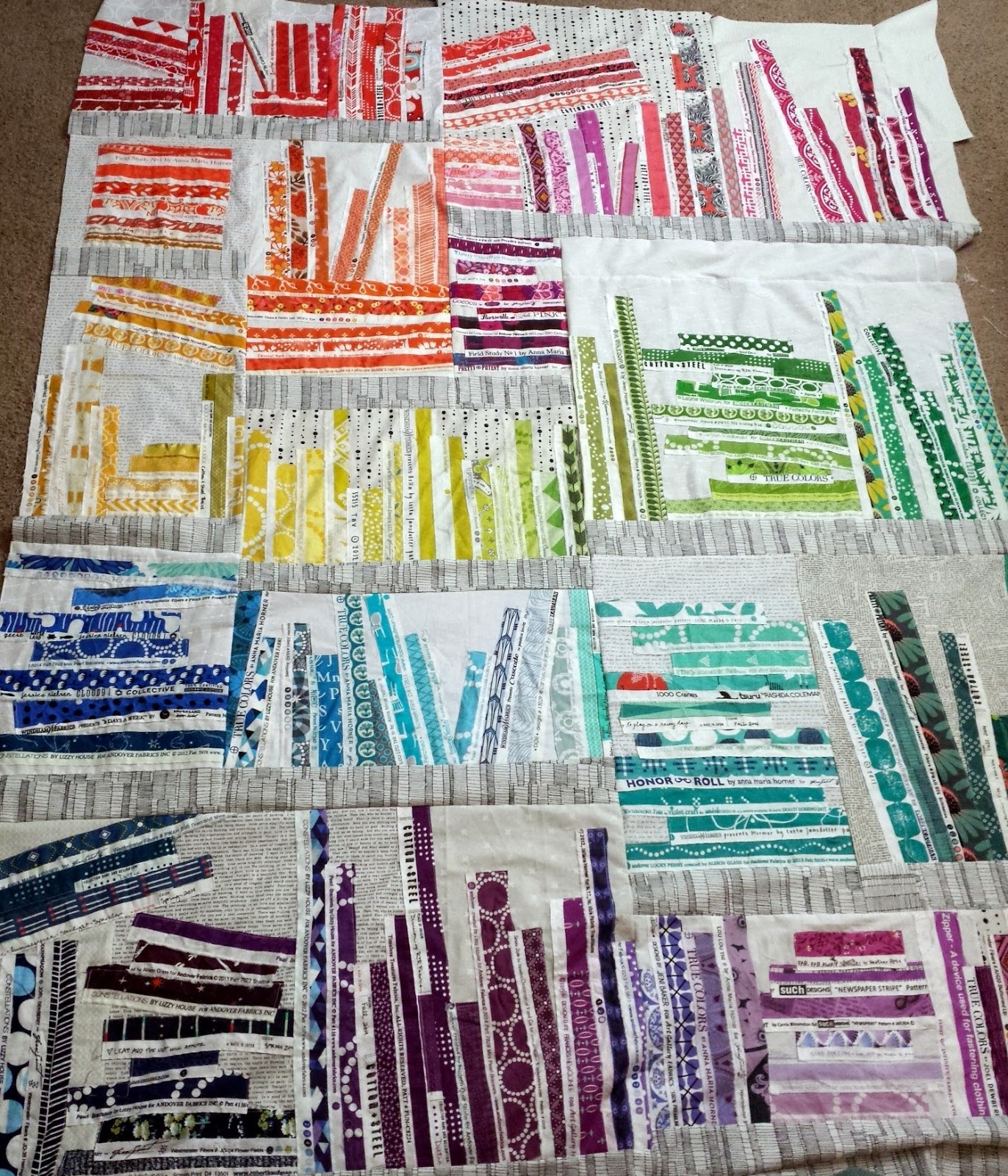 Congratulations on getting the top pieced - it looks great and like it is a great sized quilt. I really like how each color / shelf is slightly different; it makes it a really interesting and fun design.