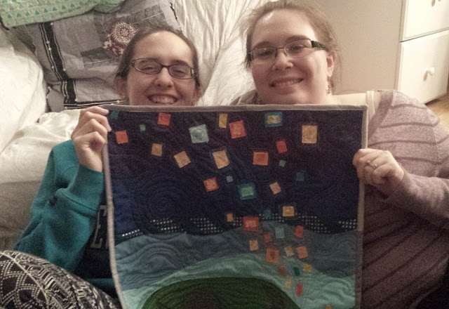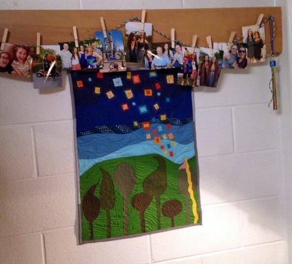 "Tomorrow night, the lights will appear, just like they do on my birthday each year." I quilted some of the song into the quilt, as you can see on my original blog post.
