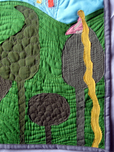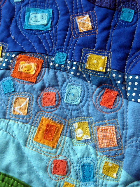 I chose to share this mini quilt again because my sister and I love it so much. With the addition of LOTS of free motion quilting, the scene really came to life. I had a blast deciding how to quilt the trees differently, how to applique and quilt Rapunzel's hair, how to make the lanterns glow, etc.