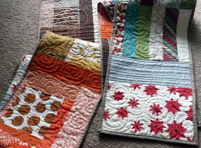 Blog posts need photos, so here are some recently commissioned fall/winter double-sided table runners!