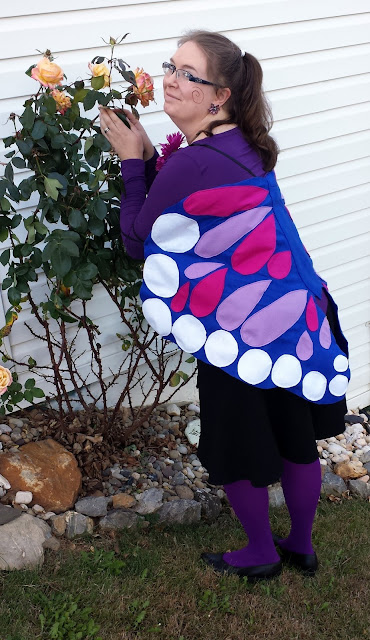 I wanted to make my costume from scratch, and I wanted it to be cheap but reusable. The link to this Buggy and Buddy butterfly wing tutorial popped up on Facebook a couple of weeks ago, and I knew I had found my costume. I didn't change the measurements at all from the kid size; I just extended the elastic. To decorate the felt background, I cut out pink, light purple, and white two at a time and appliqued them with my sewing machine (I skipped the glue step and used pins). The costume cost about $7, including the black elastic on sale! Plus, it only took a couple of hours to put together!