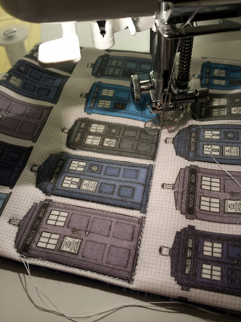 Mike requested that I use some of the TARDIS fabric left over from his Doctor Who quilt ("Allons-y, Allonso"). I bought the fabrics on Spoonflower in 2013, and it's been a worthy investment; we use that quilt every day. :) By the way, I can't find the two prints pictured on Spoonflower - they may be gone.