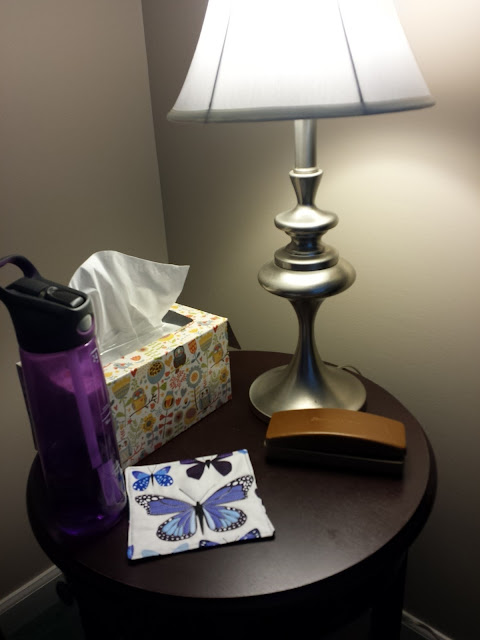 I had received some lovely coasters made of quilting cotton in the mail about three years ago in a swap. We used them every day, so they got pretty ratty. This is another reason why I don't make clothes out of quilting cotton because I worry that under heavy use, they won't last (hence my current obsession with buying knits, chambray, and voile). I'm sure that we could have washed the coasters and that would have helped, but at this point, I wanted to make my own. So when we moved, I threw the other ones away. They had a good run!