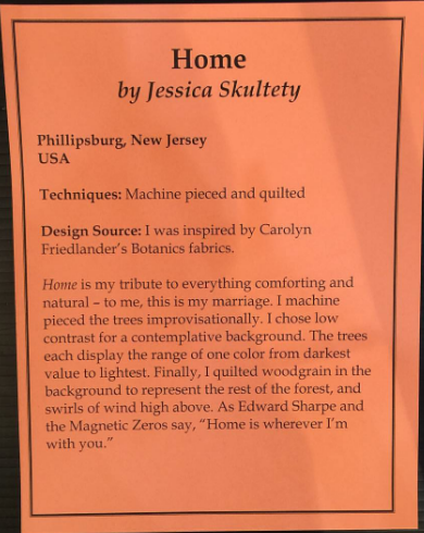 I entered two quilts into the Modern Quilt Guild exhibit, and one was accepted out of over 130 entries (I remember doing a happy squeal/dance at Shoprite when I received the email). Ironically, this was not the quilt I thought would get in, if any. I submitted Pebble Cascade first and foremost, and entered Home only because I could enter two quilts. Imagine my pleasant surprise.