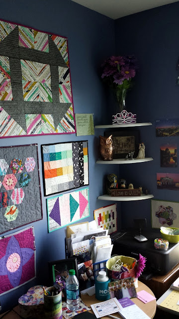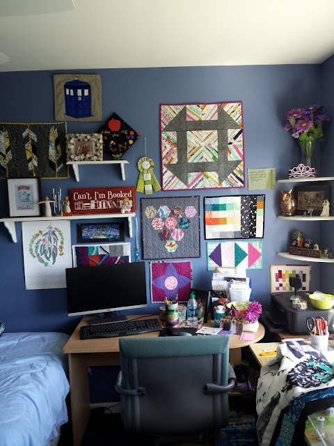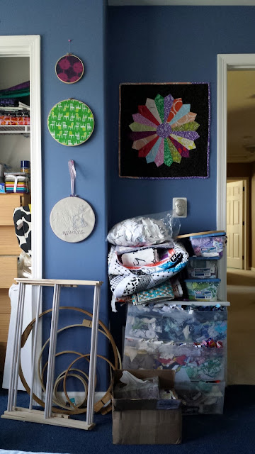 Oh my, I'm scared for all your WIPs on top of the scrap bin; it looks ready to give out on you! I can totally relate to having to move something one too many times. I love your mini quilt display, the blue walls actually set them off quite nicely.