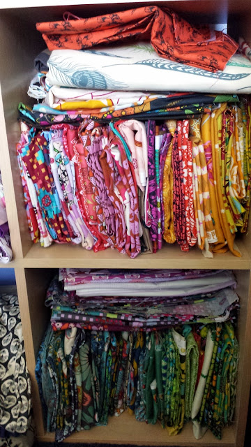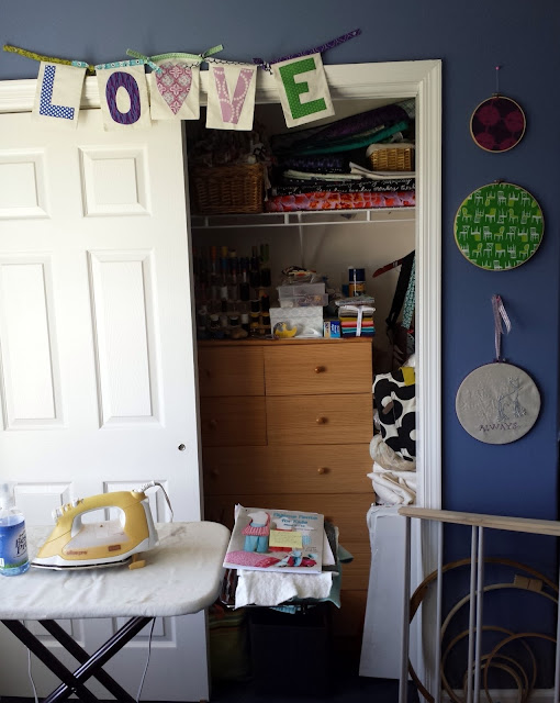 View from my computer: the closet and some more of my handmade decorations (I received the bunting in a swap a few years ago and haven't had a place to hang it!). I have use of half the closet, so I piled thread, selvages, batting, and the couple of bolts I have in there. Plus: