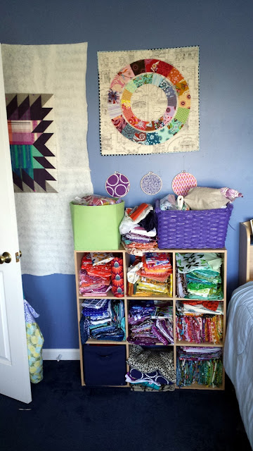 If you turn right from there, you'll see most of my stash next to the guest bed! I organized it by color and it's so nice to be able to see everything from where I'm sewing (when I turn around, that is). The blue basket at the bottom contains all of my solids. On top I have a green basket of AMH scraps (because those are special), and a purple basket of WIPs. I hung some more of my favorite fabrics in hoops above, and then my Perspective mini from Heidi - one of my most prized possessions! Behind the door you can see my makeshift design wall (batting tacked with push pins) and my Loominous quilt in progress.