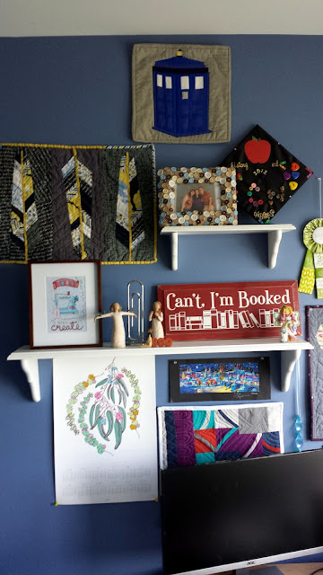 Hanging on top from left to right: Birds of a Feather (by me), TARDIS mini (by my friend @amysblanchard from the CJMQG), CJMQG QuiltCon ribbon (as president, I'm the current keeper!). Below the shelf: Anna Maria Horner calendar, art I bought in Prague (my second favorite city), Wanderer (by me).