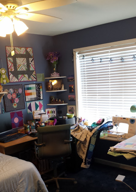 This space is cozy and useful but smaller than my previous space in the apartment (mostly because of the full size bed). I have to journey to different parts of the house to take pictures (the dark carpet dims everything) and to baste (I was crawling all over the living room last night) but it will do!