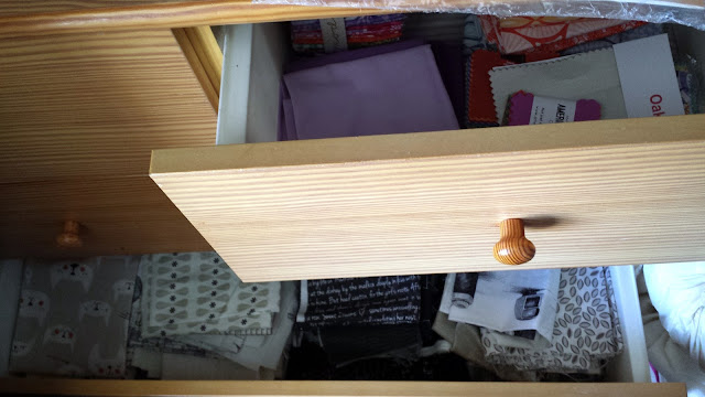 All the drawers are full of fabric. Score. Well not full, but in use. The top two are precuts, and from there I have multicolored fabrics (not pictured), gray, low volume, and black (pictured), and garment fabric (not pictured).