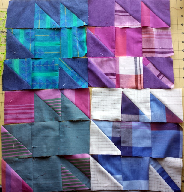 I only made 12 of these Modern Maple blocks, but would you believe how long it takes for each step? Not that I minded - it gave me something to look forward to when I was working too hard on other things. The "typical" size is a 12" finished block, but I wanted mine smaller. Right when I was about to quit looking and figure out the quilt maths on my own, I found a tutorial for a 9" finished block on Sew Lux (this is the larger size listed). Score!