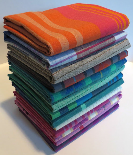 I started with a pile of Loominous fat quarters from Sew Me A Song, my longtime blog sponsor. It's woven cotton dotted here and there with metallic by my favorite fabric designer, Anna Maria Horner. The drape and softness of this fabric is hard to pass up (though it does fray and stretch easily, much more so than quilting cotton - the only downsides).