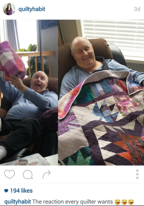 I posted my dad's reaction to the quilt on Instagram when he unwrapped it on Christmas morning. He was putting on a bit of a show (he's my goofy dad) but in all seriousness, it's everything and more that a quilter can ask for!