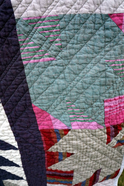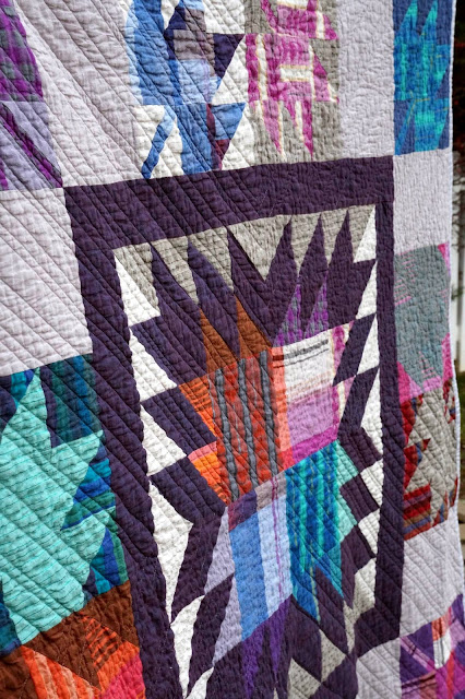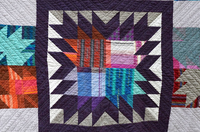 Once the top was pieced, I was pleased. However, the quilting had me stuck - except that I wanted it to come from the middle. My husband Mike, ever the quilt genius, suggested quilting straight lines along the four triangles that emerge naturally. I sighed because I knew it would be monotonous, but super effective (this is starting to sound like a Pokemon battle).