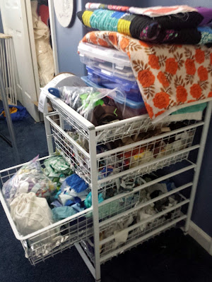 I decided it was high time to address the scrap problem - throw some out (the teeny tiny pieces, the ones I'll never use because they are poor quality, etc.), pack some away to give away to the guild, and organize anew. Luckily, my sister had a set of wire drawers she wasn't using, and