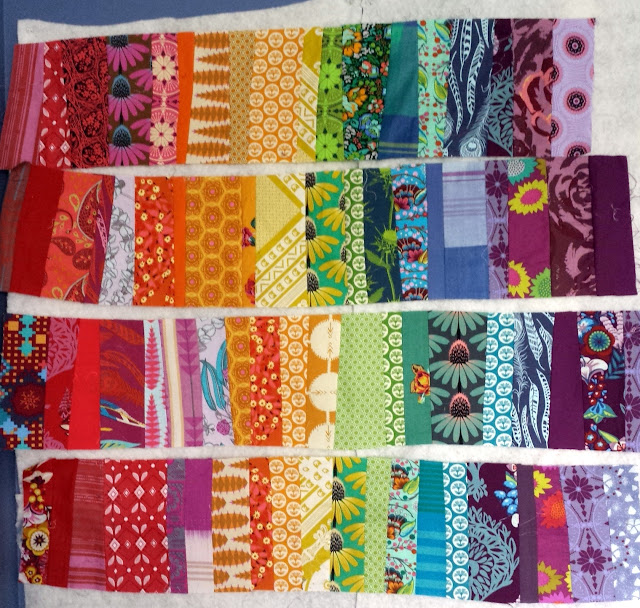 I currently have two very selfish, very awesome long term projects: the epic Anna Maria Horner Medallion, and my Meadow quilt). If I chip away at them in little pieces between holiday and deadline sewing, I make progress on everything. I've been dreaming of which fabrics I'm going to cut in next; I'm going to need more of these rainbow strips, and so far, this is just from my scraps. I'm enjoying piecing them together at random, wonky angles. It's a freeing, therapeutic, and cheering activity!