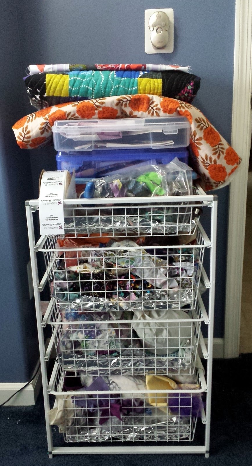 I decided it was high time to address the scrap problem - throw some out (the teeny tiny pieces, the ones I'll never use because they are poor quality, etc.), pack some away to give away to the guild, and organize anew. Luckily, my sister had a set of wire drawers she wasn't using, and