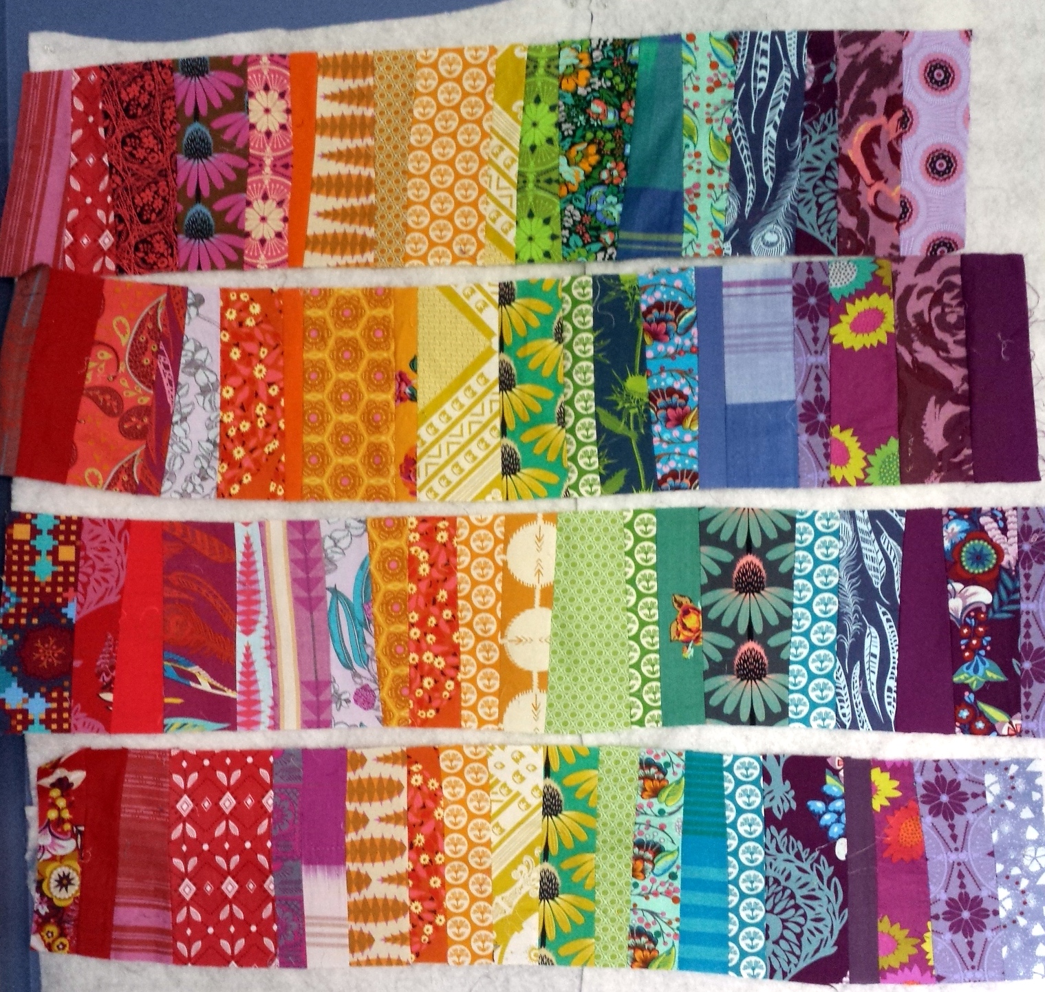 I currently have two very selfish, very awesome long term projects: the epic Anna Maria Horner Medallion, and my Meadow quilt). If I chip away at them in little pieces between holiday and deadline sewing, I make progress on everything. I've been dreaming of which fabrics I'm going to cut in next; I'm going to need more of these rainbow strips, and so far, this is just from my scraps. I'm enjoying piecing them together at random, wonky angles. It's a freeing, therapeutic, and cheering activity!