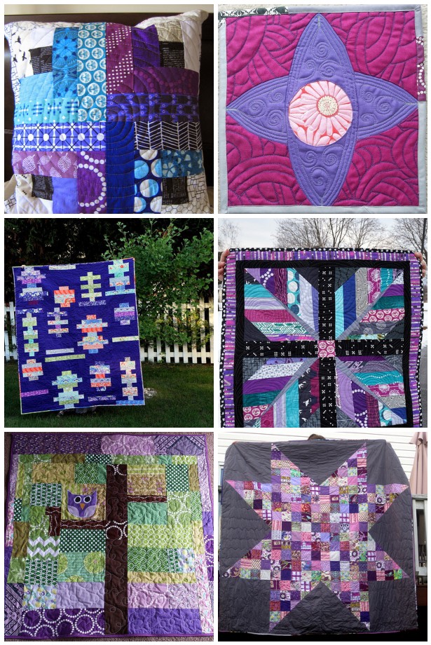 1. Purple and Blue Log Cabin Pillow, 2. Meadow Mini Quilt, 3. "Midsummer", 4. "Plumes of Orchid" mini quilt, 5. "Hoot" baby quilt, 6. "Flying Purple People Eater"