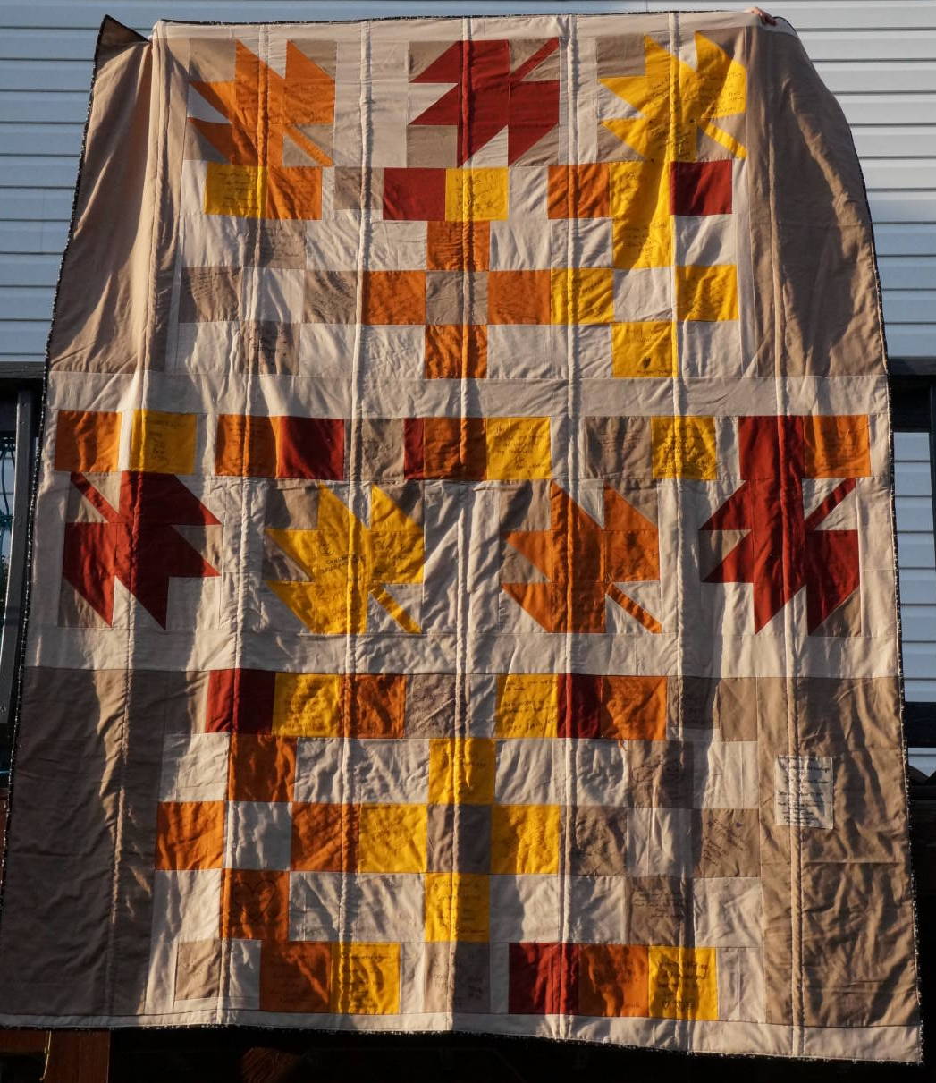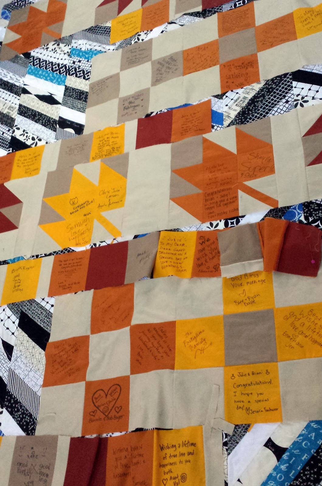 The backing was especially exciting to plan and create. Just like my wedding quilt, I offered Julie and Brian the option of sewing up their wedding guestbook. We based the colors on their autumn wedding attire/flowers. :)