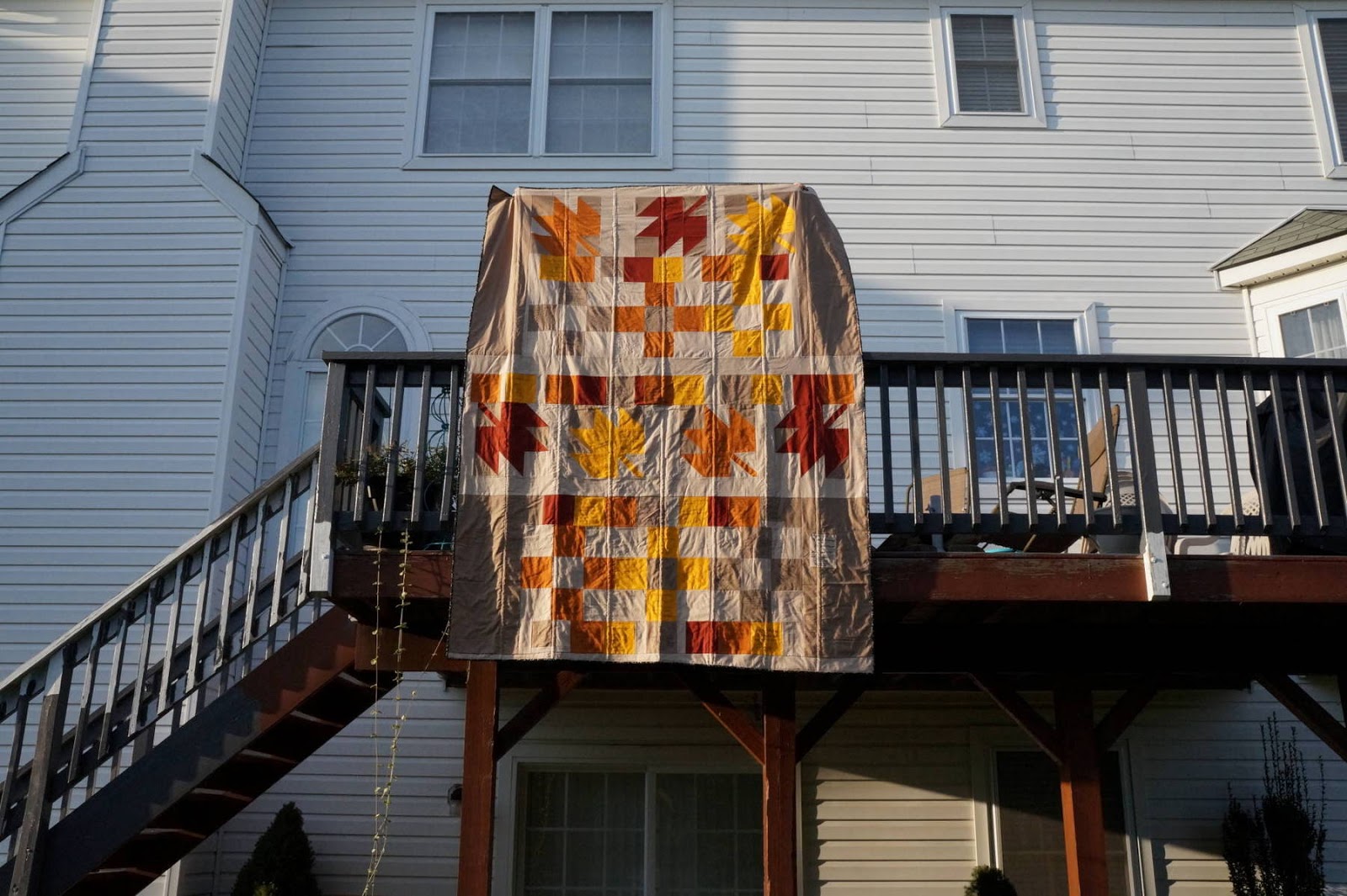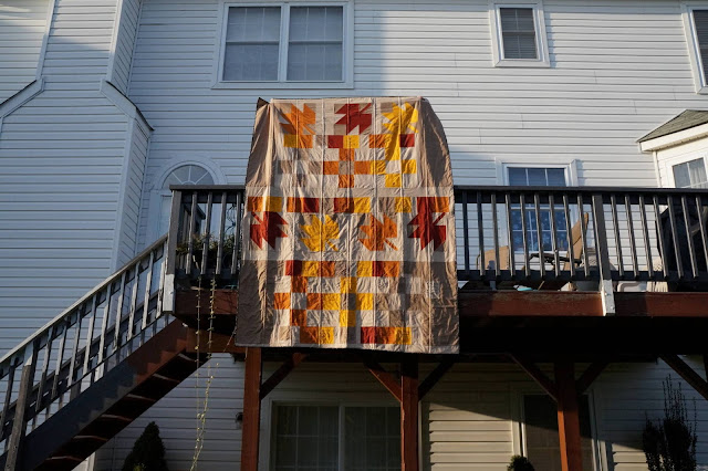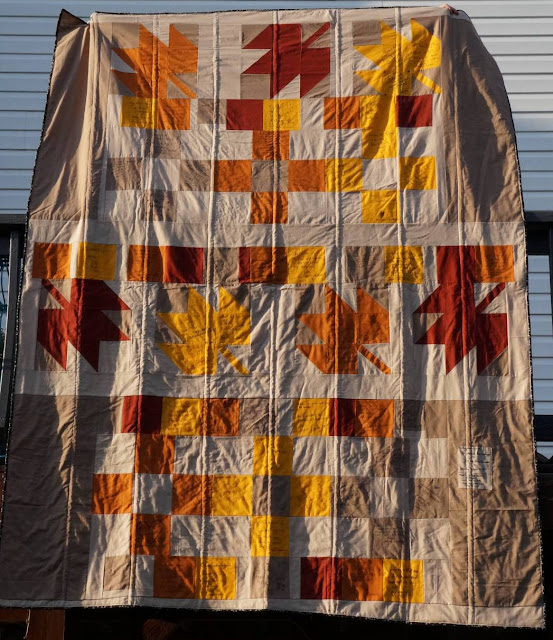 Here's a work in progress shot of putting the backing together. Oversized modern maple blocks and the colors represent the October wedding, and the crosses are based on their church's backsplash (see what happens when you invite quilters to weddings?). Some squares were sewn together at random in between to create interest.