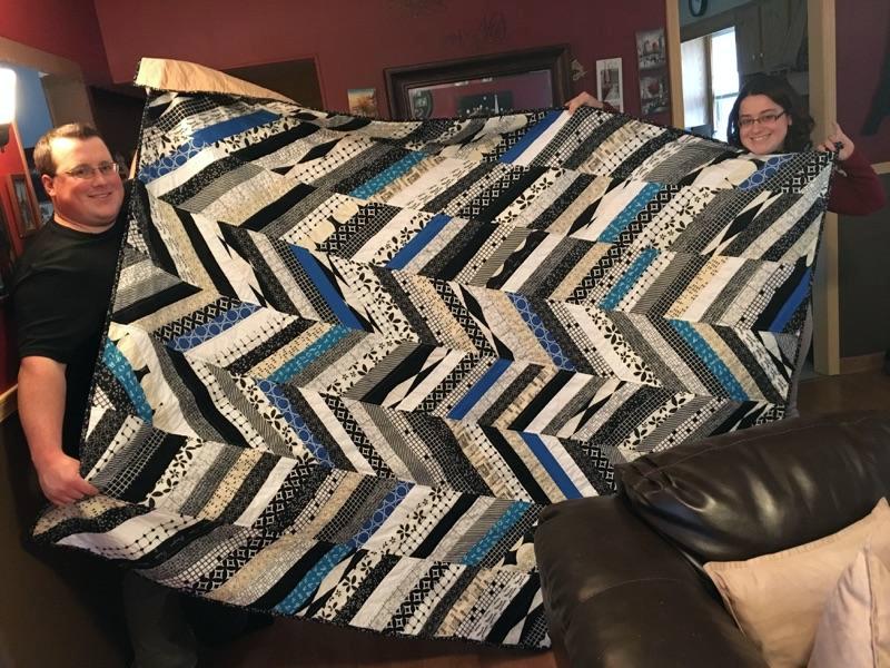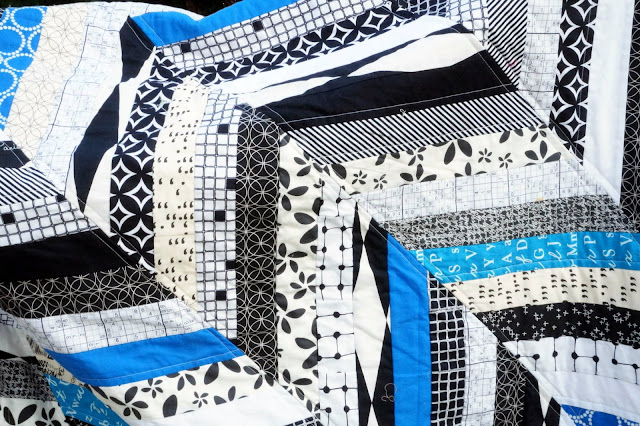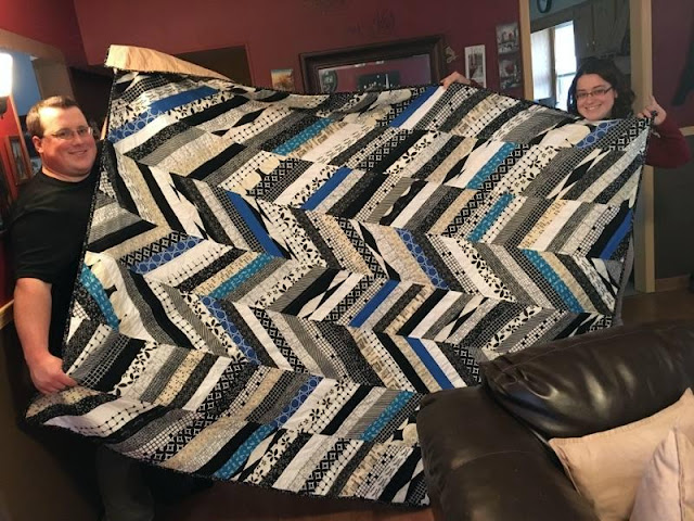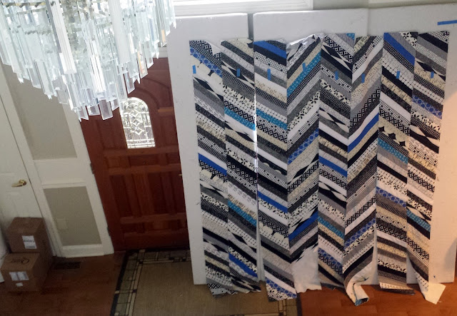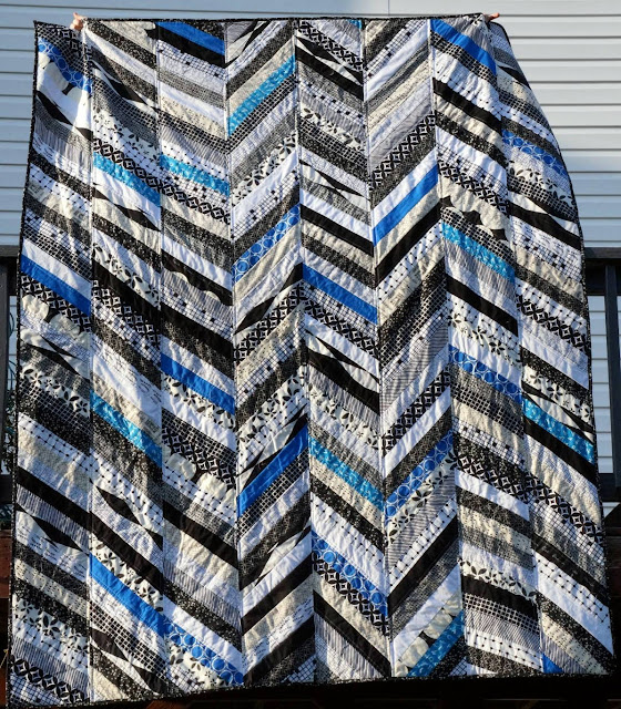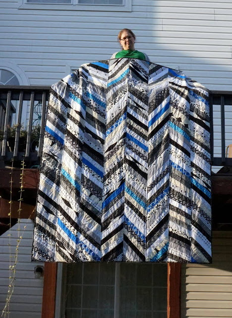 The QAYG Herringbone tutorial is thorough and well-written, but this is by no means a fast quilt. Sewing the strips onto batting took A.G.E.S. I guess if you consider the quilting I didn't do on top (though I added in some straight lines for looks), I may have saved time overall. I only worked on this project when I was sewing with friends or watching a movie so I was significantly distracted from the boredom. :D Just being honest! Choosing which strips to go next was intriguing, though.